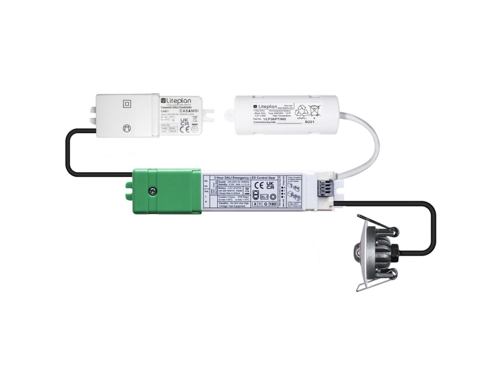 A Casambi Ready 3-hour self-test emergency driver with one of a range of ceiling recessed LED devices, supplied complete with the latest extra long life